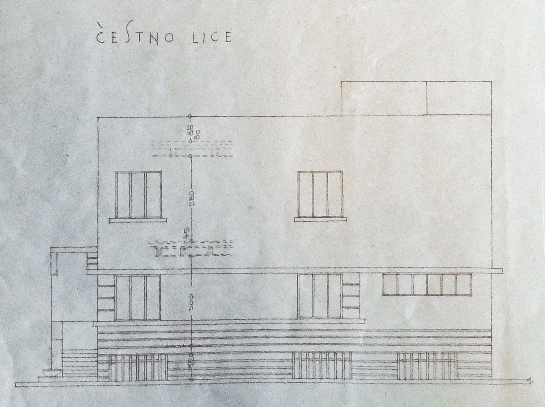 The single-storey villa with a high ground floor and a basement has a rectangular ground plan. A paved stone path takes you from Rosinova ulica over a staircase to the main entrance. The latter is placed under a covered, independent area on the shorter, western side of the villa, while the exit to the garden is situated on the northern, longer side of the building (fig. 1). The villa has a flat terrace roof, the walls are covered with white plaster and articulated by asymmetrically positioned windows of different heights and shapes, a stringcourse between the ground floor and the first floor, and rectangular window lintels. A base moulding with horizontal bands in plaster surrounds the entire house (figs. 2, 3, 4).