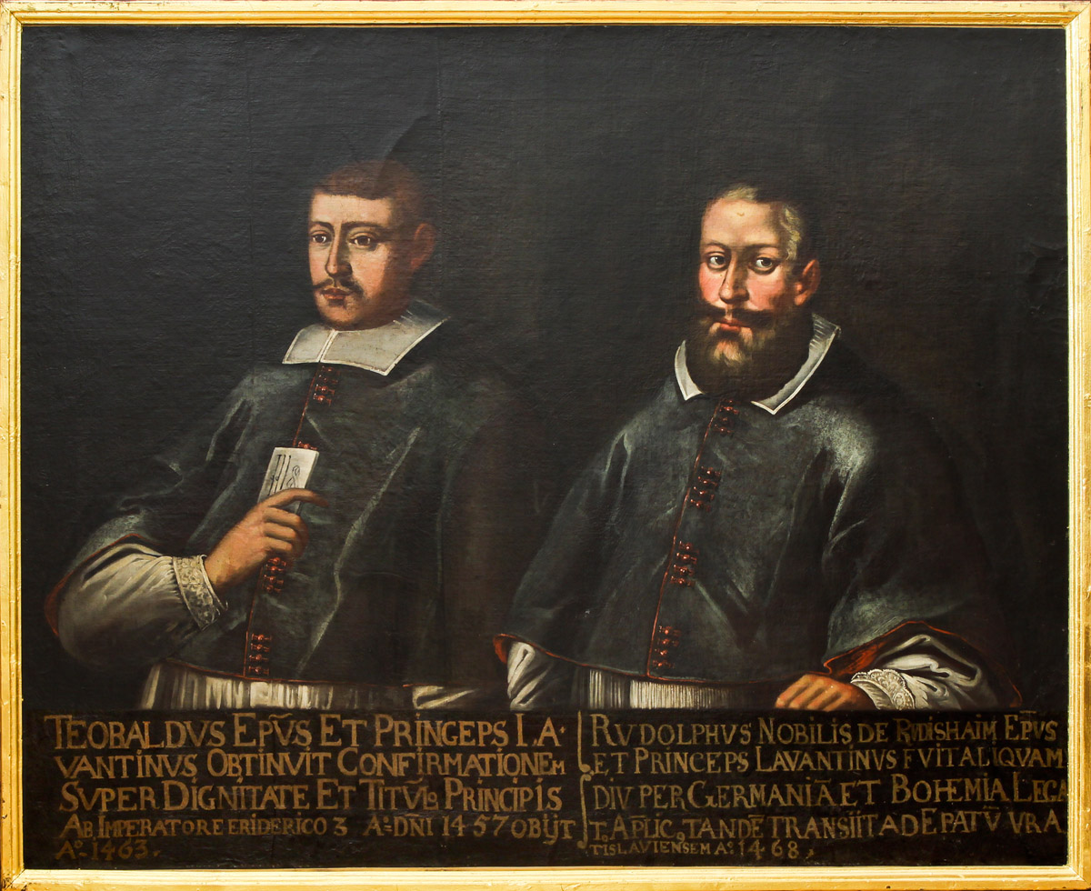 Podnapis: RVDOLPHVS NOBILIS DE RVDISHAIM EP[ISCOP]VS / ET PRINCEPS LAVANTINVS FVIT ALIQVAM/DIV PER GERMANIA[M] ET BOHEMIA[M] LEGA/T9 AP[OSTO]LIC9 TANDE[M] TRANSIIT AD EP[ISCOP]ATV[M] VRA=/TISLAVIENSEM A:o 1468.