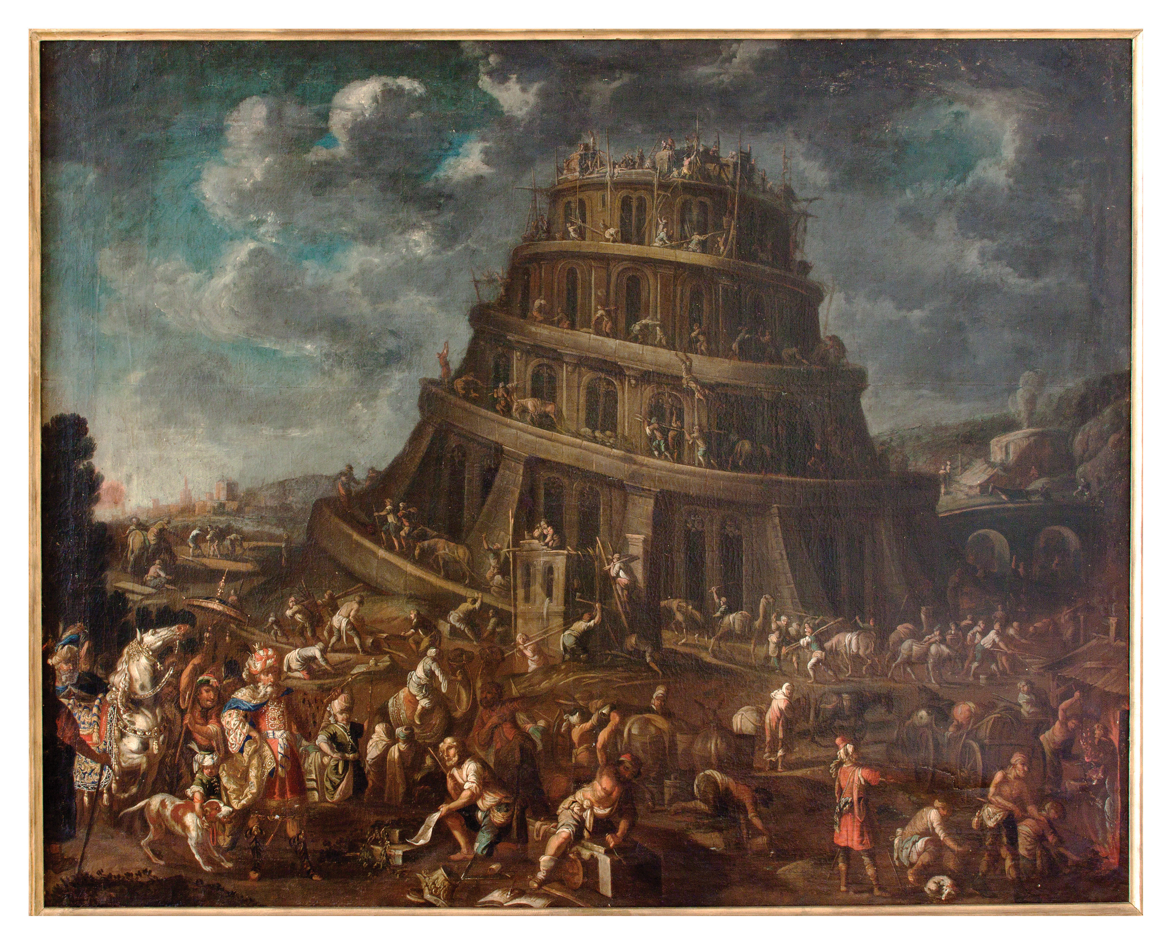 Slika predstavlja gradnjo babilonskega stolpa. Na stavbi, ki se spiralasto dviguje proti nebu, stojijo ljudje, eden pada v globino. V ozadju se odpira pogled na mesto Babilon. V ospredju so upodobljeni ljudje pri najrazličnejših opravilih. Z leve strani prihaja kralj Nemrod v spremstvu straže. Kot znamenje božje nenaklonjenosti izgradnji stolpa dogajanje zaznamuje nevihtno nebo.