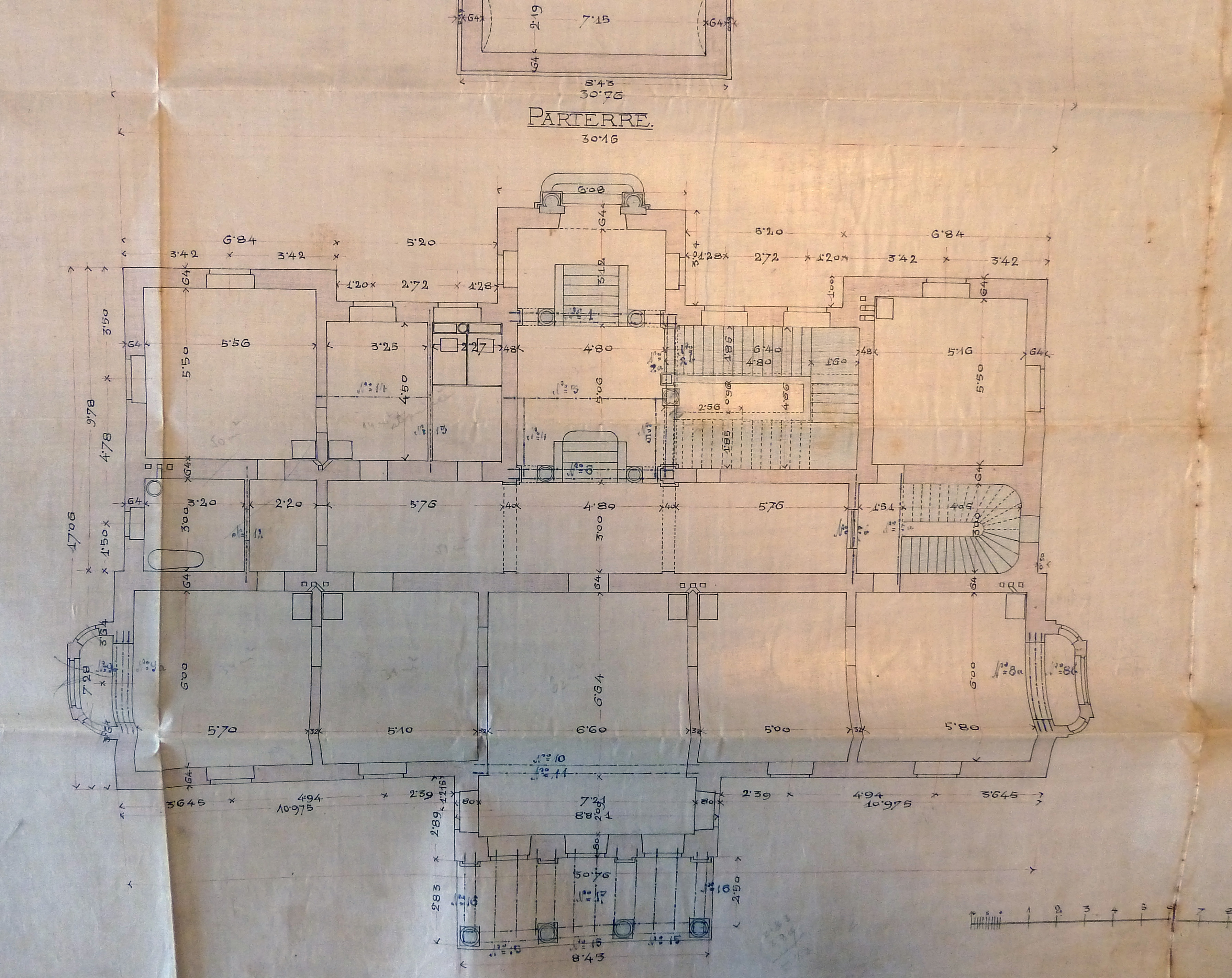 Paladijevska vhodna veža, kjer banjasti obok s podpornimi stebri tvori par serlian, se na desni odpira v triramno slavnostno stopnišče, ki vodi v prvo nadstropje; po prvotnem načrtu, pred spremembo Tschernitschka, je bilo stopnišče postavljeno na levo stran vhodne veže. Sobe so v vseh etažah razporejene vzdolž dolgega hodnika, na severnem koncu katerega bi po Theyerjevem načrtu stalo pomožno stopnišče za posle. Prvotna oprema vile je večinoma izgubljena; v prvem nadstropju so se ohranili stari intarzirani parketi in lesene parapetne obloge, med stalno razstavljenimi muzejskimi predmeti pa je tudi Scherbaumov salon.