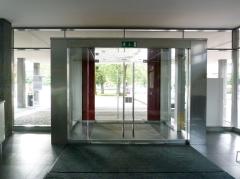 K zahodnemu pročelju je v njegovem severnem delu s prosojnim pritličnim steklenim hodnikom pripet samostojen, nižji in manjši objekt kvadratnega tlorisa in z ravno streho, postavljen na 16 betonskih stebrov kvadratnega prereza, ki so oblečeni v terazzo. Ta samostojni objekt, v katerem je v nadstropju velika predavalnica, je tlorisno nekoliko izmaknjen iz ravnine severnega pročelja; s stebri sega na pločnik ob Razlagovi ulici in ustvarja pokrito površino za pešce. Vhod v šolo vodi prav skozi ta stebriščni prostor in skozi zastekljeni vezni hodnik. Velika predavalnica v nadstropju se z velikimi okni odpira proti jugu in severu, na zahodnem pročelju vhodnega kubusa pa se ponovi za Kocmuta značilni pomol s polno zahodno ter zastekljenima kratkima južno in severno stranico.