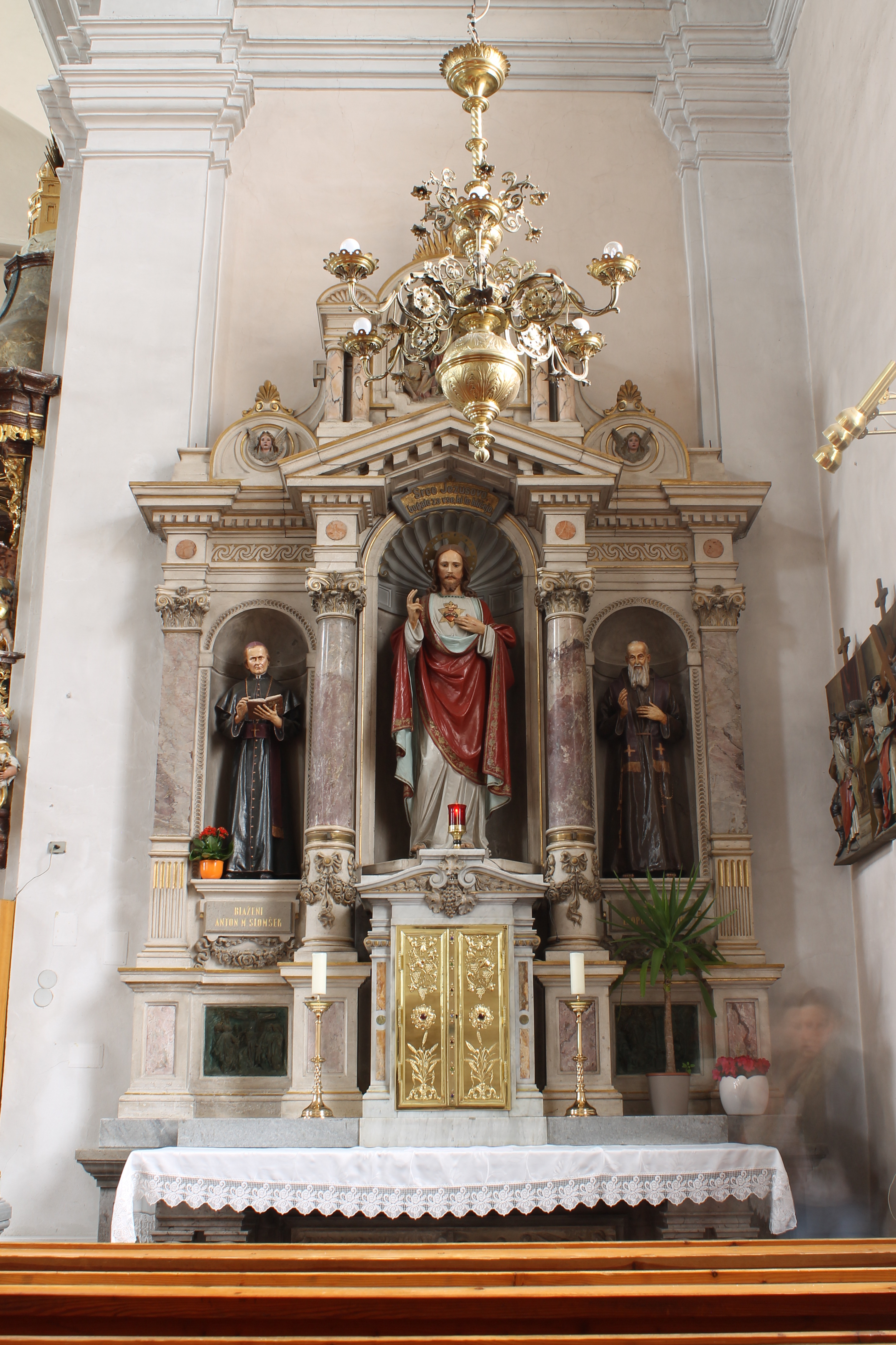 Neorenesančna stranska oltarja sta posvečena Mariji Čudodelne svetinje in Srcu Jezusovemu. Prvega je leta 1904 izdelal kamnosek Ignacij Čamernik iz Celja, kiparski okras zanj pa je delo podobarja Josipa Grošlja (1854-1941) iz Selc nad Škofjo Loko. Drugi oltar je iz leta 1910 in je delo mariborskega kamnoseka Karla Kocijančiča (+1915). Od prvotnega kiparskega okrasa, ki je bil delo graškega kiparja Eduarda Kupowskega (tudi Kubowski), se je ohranila plastika Srca Jezusovega ter reliefa z upodobitvama Zveličarja z dušami v vicah ter sv. Andreja, kipa kitajskih mučencev sv. Janeza Gabrijela Perboyre in sv. Frančiška Cleta pa sta bila po letu 2000 po nepotrebnem zamenjana z manj kvalitetnima plastikama bl. Antona Martina Slomška in sv. Leopolda Mandića.