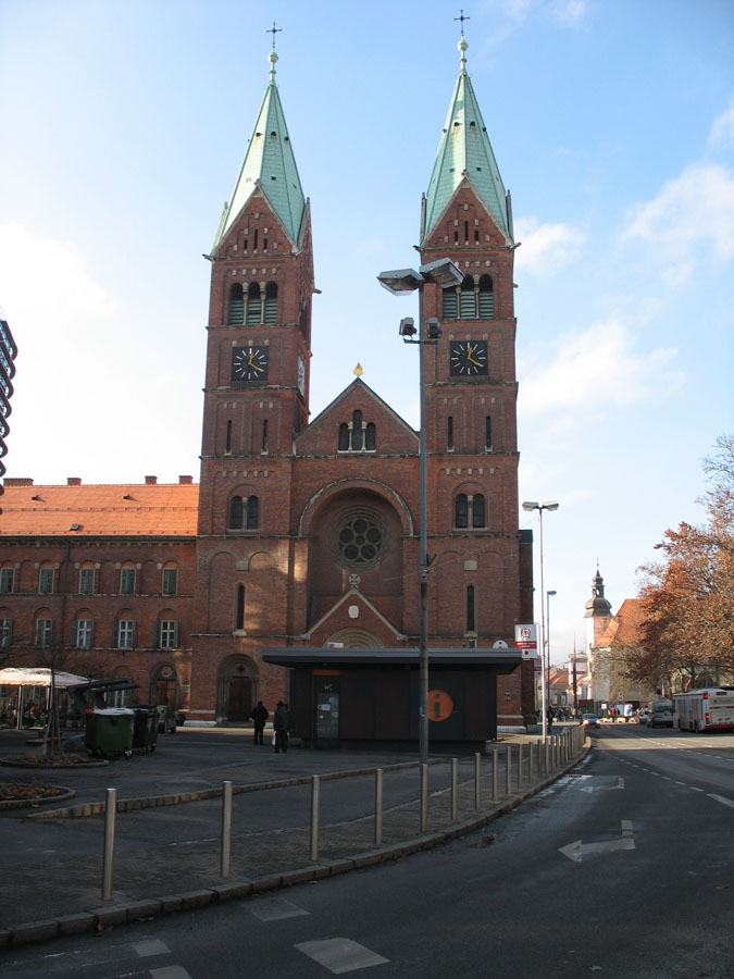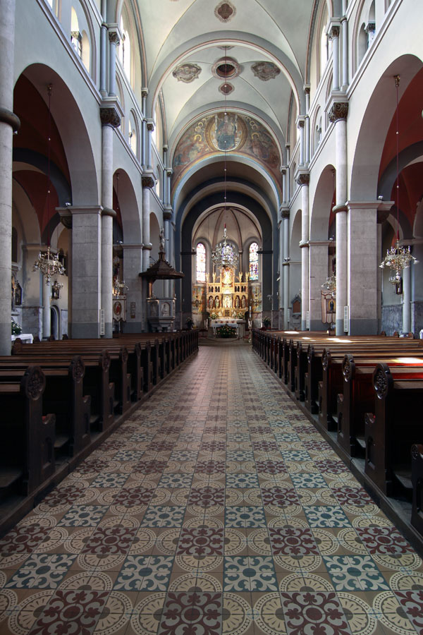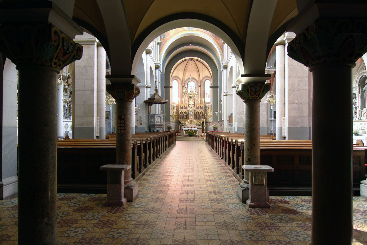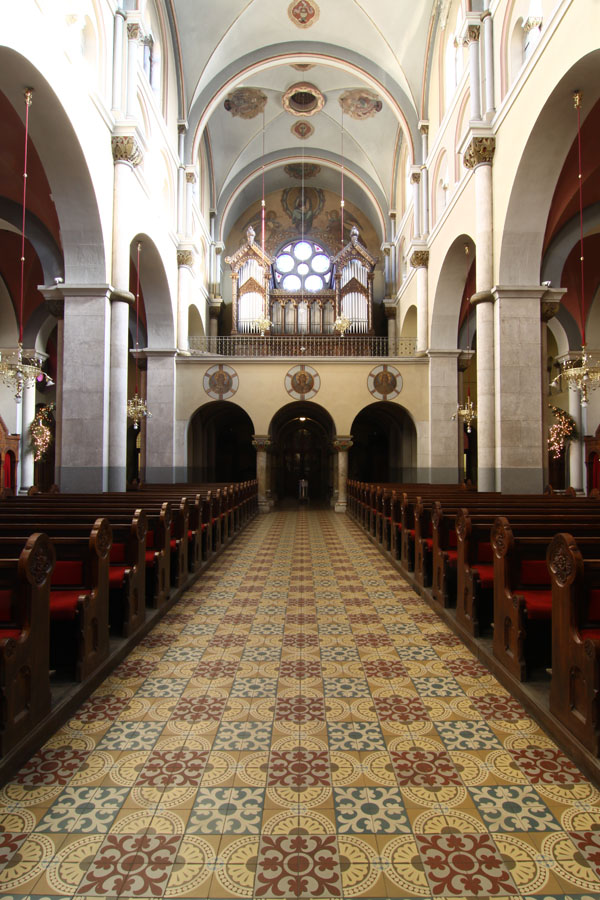 Proti zahodu orientirana cerkev je triladijska bazilika. Tristrano sklenjen prezbiterij na severni strani obdaja kapela z oratorijem, na južni pa t. i. zgornja zakristija (prostor naj bi bil po prvotnih načrtih krstilnica, kar pa ni bilo izvedeno), nad katero je meniški oratorij. Med »zgornjo zakristijo« in kapelo poteka pritlični hodnik, ki na zunanjščini učinkuje kot korni obhod (deambulatorij). Zunanjščina je zgrajena iz neometane temnordeče opeke, kombinirane s kamnitimi sivo-belimi stavbnimi členi. Fasado poudarjata zvonika s korenastima strehama, vse stene zunanjščine pa krasijo različni neoromanski stavbni členi (bifore, trifore, rozeta, polkrožni portali vrat, ločni friz, zunanji oporniki). Notranjščina je obokana križnogrebenasto (ladijski del) ali banjasto (prezbiterij), sklep prezbiterija pa pokriva polkupola, na katero so prilepljena dekorativna rebra pravokotnega profila, ki jih nosijo služniki. Ladje med seboj ločujejo slopi s polkrožnimi arkadami, v glavni ladji slope obdajajo za Jordana značilni tričetrtinski stebri z vegetabilnimi kapiteli.