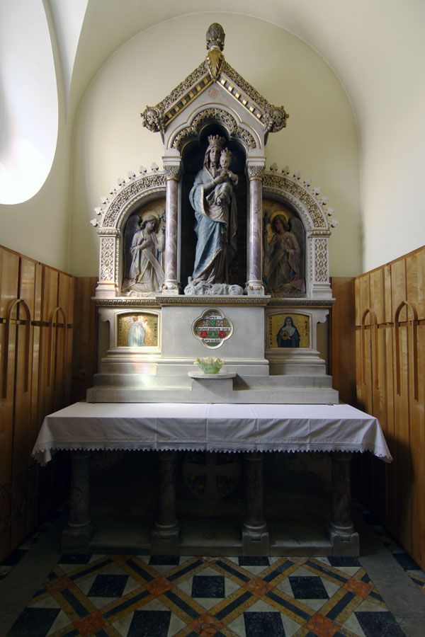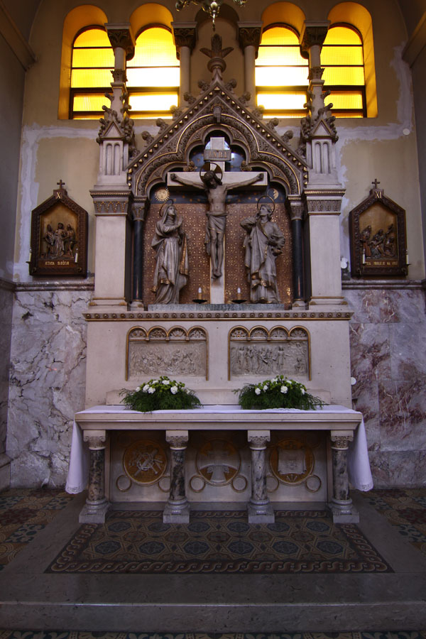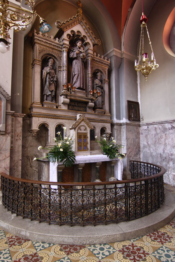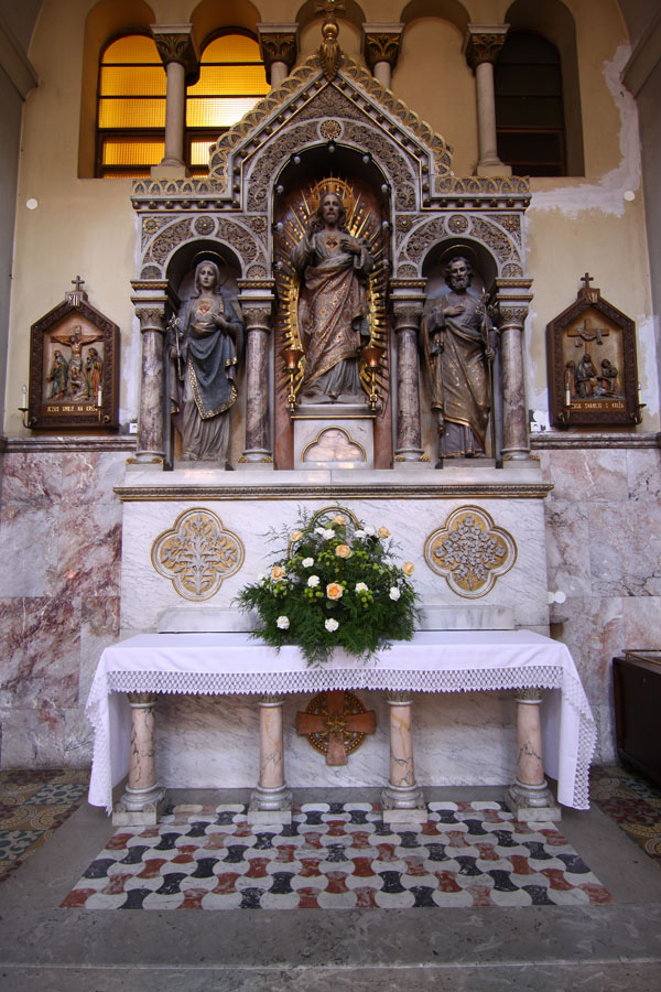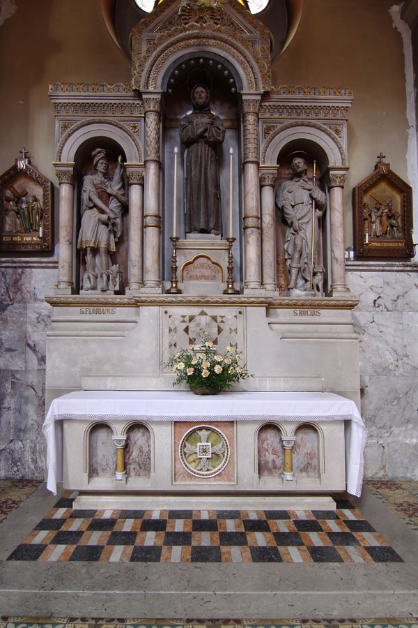 V nekaj več kot desetletju po posvetitvi je cerkev dobila osem oltarjev; velikega (posvečenega Mariji Materi usmiljenja, menza 1900, nastavek 1904), sv. Filomene (menza 1900, nastavek 1907), sv. Antona Padovanskega (menza 1900, nastavek 1907), Lurške Matere božje (1908), sv. Križa (1909), Srca Jezusovega (1910), sv. Frančiška Asiškega (1912) ter Naše ljube Gospe Presvetega srca (1912); slednji je v kapeli ob prezbiteriju. Vse oltarje je načrtoval arhitekt Richard Jordan, kamnoseške dele je izdelal mariborski kamnosek Karel Kocijančič (+1915), bronaste Jakob Rappel (1877-1942) iz tirolskega Schwaza, skoraj vsi kipi pa so delo graškega kiparja Eduarda Kupowskega (tudi Kubowski). Izjemi predstavljata zgodnjebaročna, sredi 18. stoletja temeljito »restavrirana« Marijina milostna podoba (imenovana tudi Urna) na velikem oltarju, ki je bila prvotno v nadžupnijski cerkvi sv. Jurija v Slovenskih Konjicah, potem v kapeli dvorca Freibüchl in v mariborski minoritski cerkvi na Lentu (v predhodnico frančiškanske cerkve je bila postavljena leta 1787), ter Lurška Mati božja v tronu istoimenskega stranskega oltarja, ki so jo leta 1884 izdelali v umetniški delavnici Atelier Verrebut v Parizu, leto dni kasneje pa postavili na stranski oltar stare frančiškanske cerkve. Deveti, pokoncilski oltar, delo arhitekta Cirila Zazule (1924-1995), je bil postavljen leta 1976 in vključuje dele nekdanje obhajilne mize.